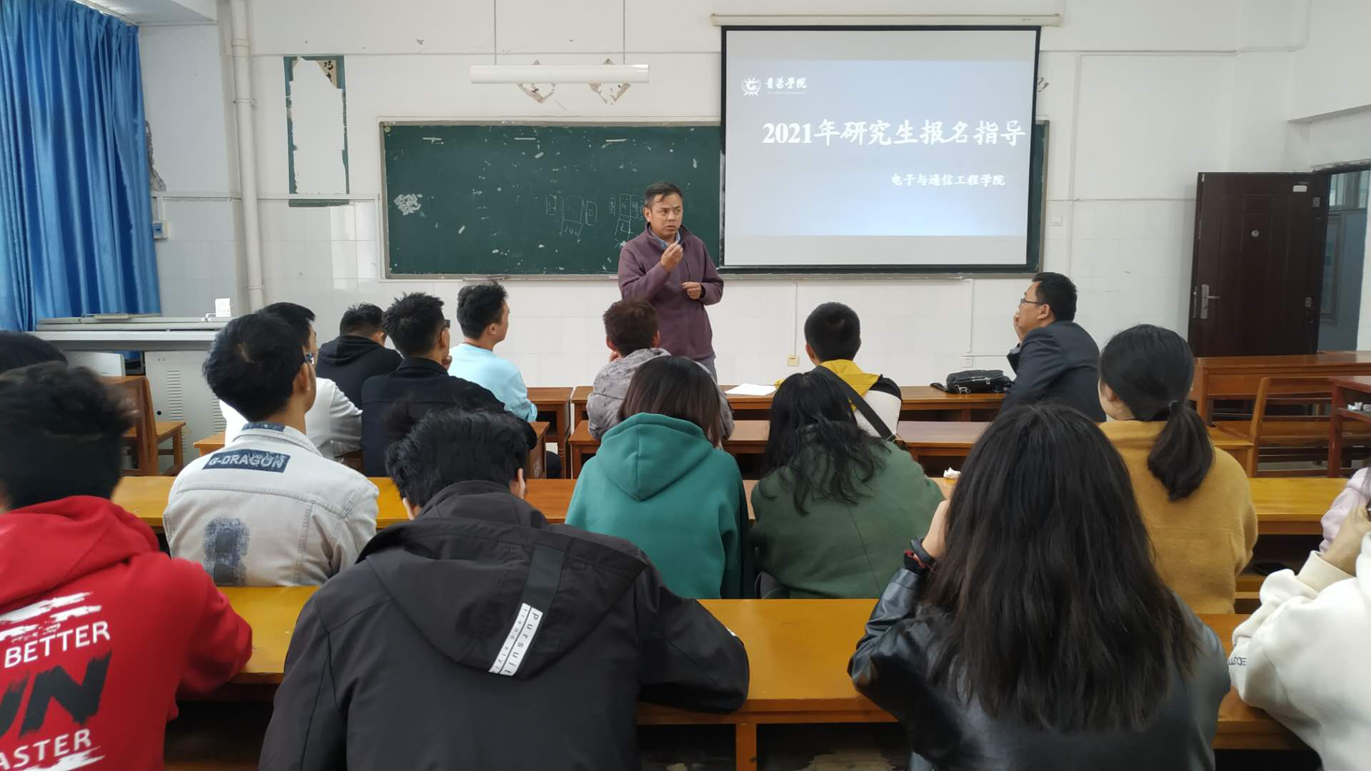 2020年10月16日下午14:30,电子与通信工程学院在C栋505教室举行考研报考学习指导会。参加会议的有2017级各班学生、班主任。本次指导会由博士、教授、电子信息科学与技术专业教研室主任周章渝老师主讲,目的在于通过对考研专业介绍、学习方法的指导以及学院为考研学生提供良好的学习场所和相关老师利用业余时间指导大家学习等方面的介绍,增强学生考研信心,动员更多学生加入考研队伍,也进一步提高我院考研录取率。