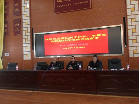 2020年11月10日中午,电子与通信工程学院防电信网络诈骗讲座于在博雅楼道德讲堂举行。参加讲座的有见龙派出所王所长、韦警官、电子与通信工程学院教研室主任孙健、辅导员张合梅以及2020级全体新生。此次讲座的目的是强化学生防电信网络诈骗意识,提高学生对诈骗信息的辨别能力,避免上当受骗。
