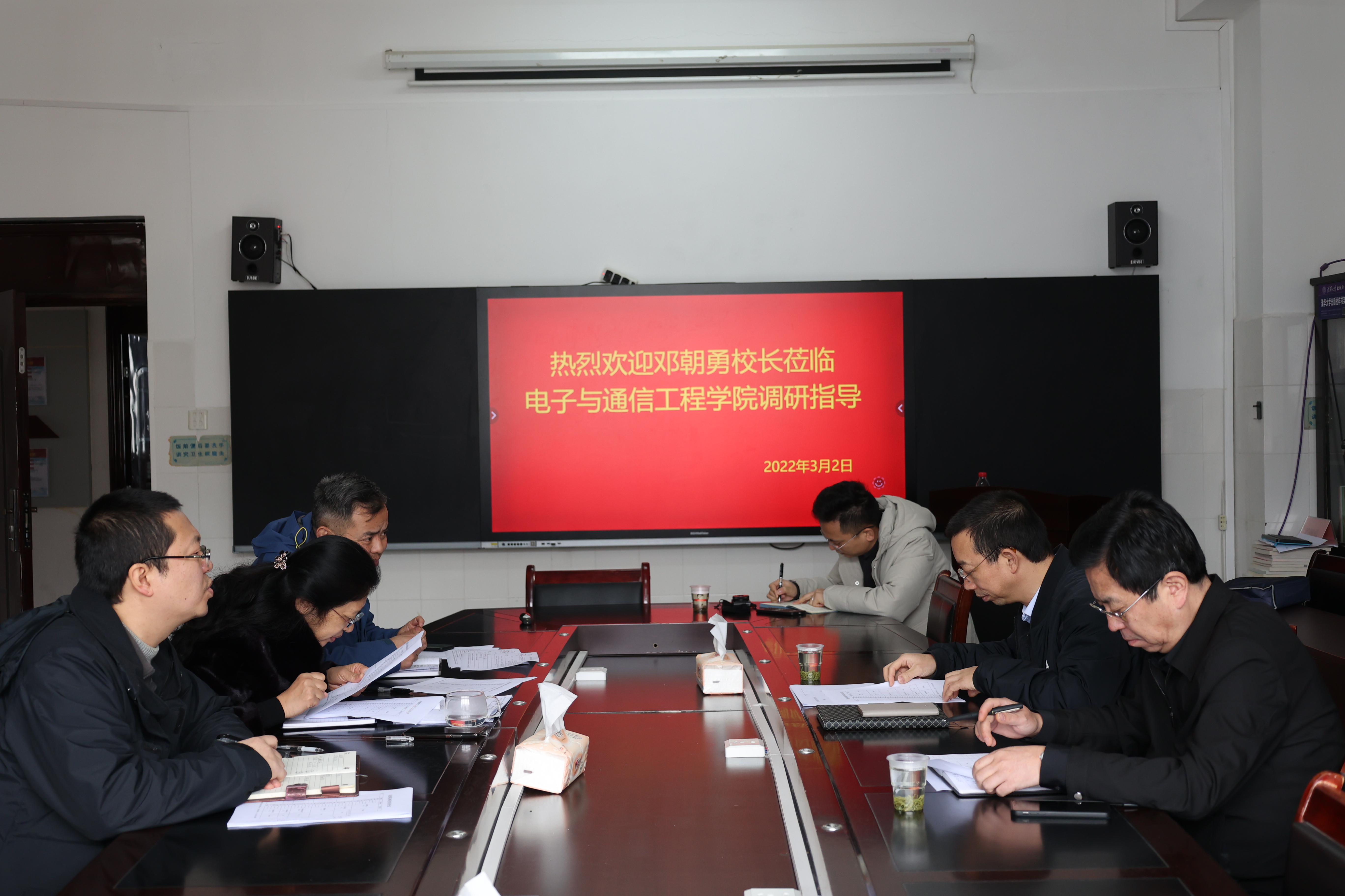 2022年3月2日上午,BW·西汉姆联党委副书记、校长邓朝勇在院长办公室主任时军陪同下,到电子与通信工程学院进行调研,了解学院新学期各项工作开展情况。学院党委书记曾何、副书记孙健和副院长周章渝分别就现阶段人才队伍建设及预发奖励性绩效工资分配方案的制定情况进行了汇报。