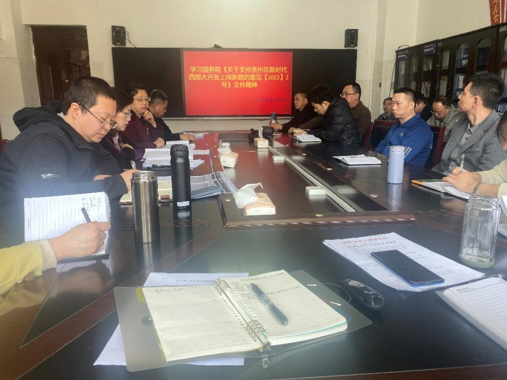 3月8日,学院组织全体教职工在学院会议室学习了《国务院关于支持贵州在新时代西部大开发上闯新路的意见》(国发[2022]2号),会议由院长陈雨青主持。