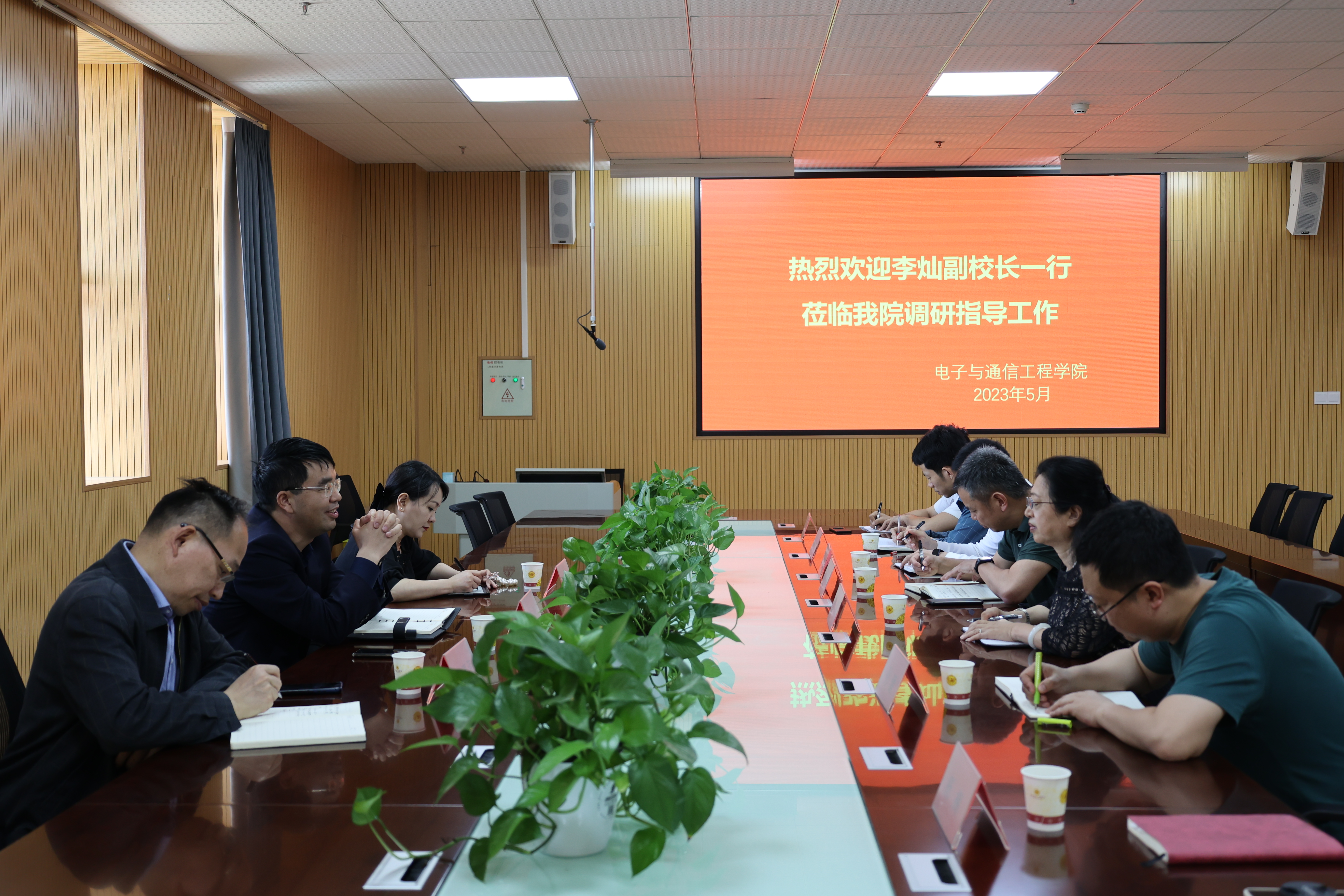 2023年5月4日上午,学校副校长李灿到电子与通信工程学院调研指导工作。教师工作处处长刘清海、校长办公室副主任袁淑敏陪同,学院党委书记曾何及学院党政领导班子成员、科级干部、教研室负责人参加会议。
